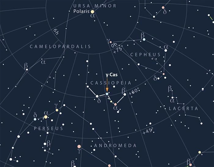 γ Cassiopeia was the first Be-type star to be identified as such by the Italian astronomer Angelo Secchi in 1866. Be stars are fast-rotating massive stars that regularly eject matter. This matter forms a disc around the star, the presence of which is revealed by characteristic emissions in their optical spectrum. In 1976, it became apparent that γ Cas emitted X-rays with a luminosity approximately forty times greater than that of comparable massive stars, with plasma heated to over 100 million degrees and unusually rapid variability. Two decades of monitoring by major space observatories subsequently revealed around twenty objects sharing these same properties, forming a subclass of stars dubbed ‘γ Cas analogues’. Astronomers at University of Liège have, in fact, played a crucial role, having identified more than half of these objects.