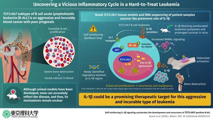 Fortunately, in a study that was published online in the journal Blood on March 03, 2026, a research team led by Professor Tomokatsu Ikawa from the Research Institute for Biomedical Sciences, Tokyo University of Science (TUS), Japan, took a major step in addressing these challenges. Their paper, co-authored by a third-year doctoral student, Ms. Aisa Suzuki from TUS and Dr. Takeshi Inukai from the University of Yamanashi, Japan, describes the development of a new laboratory mouse model that closely mirrors TCF3::HLF-positive B-ALL observed in humans. Using this model, the researchers uncovered a previously unknown mechanism that links inflammation, leukemia progression, and bone destruction.